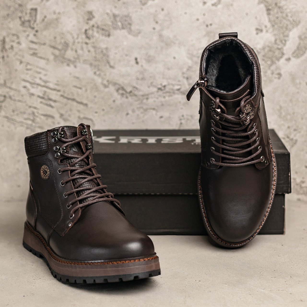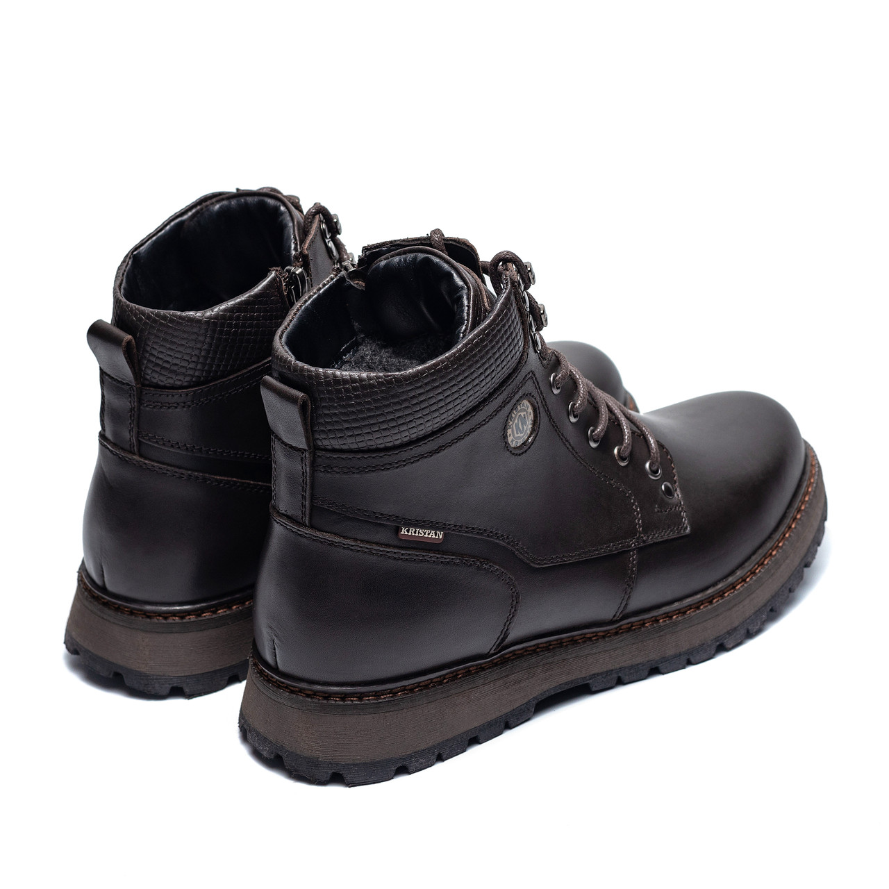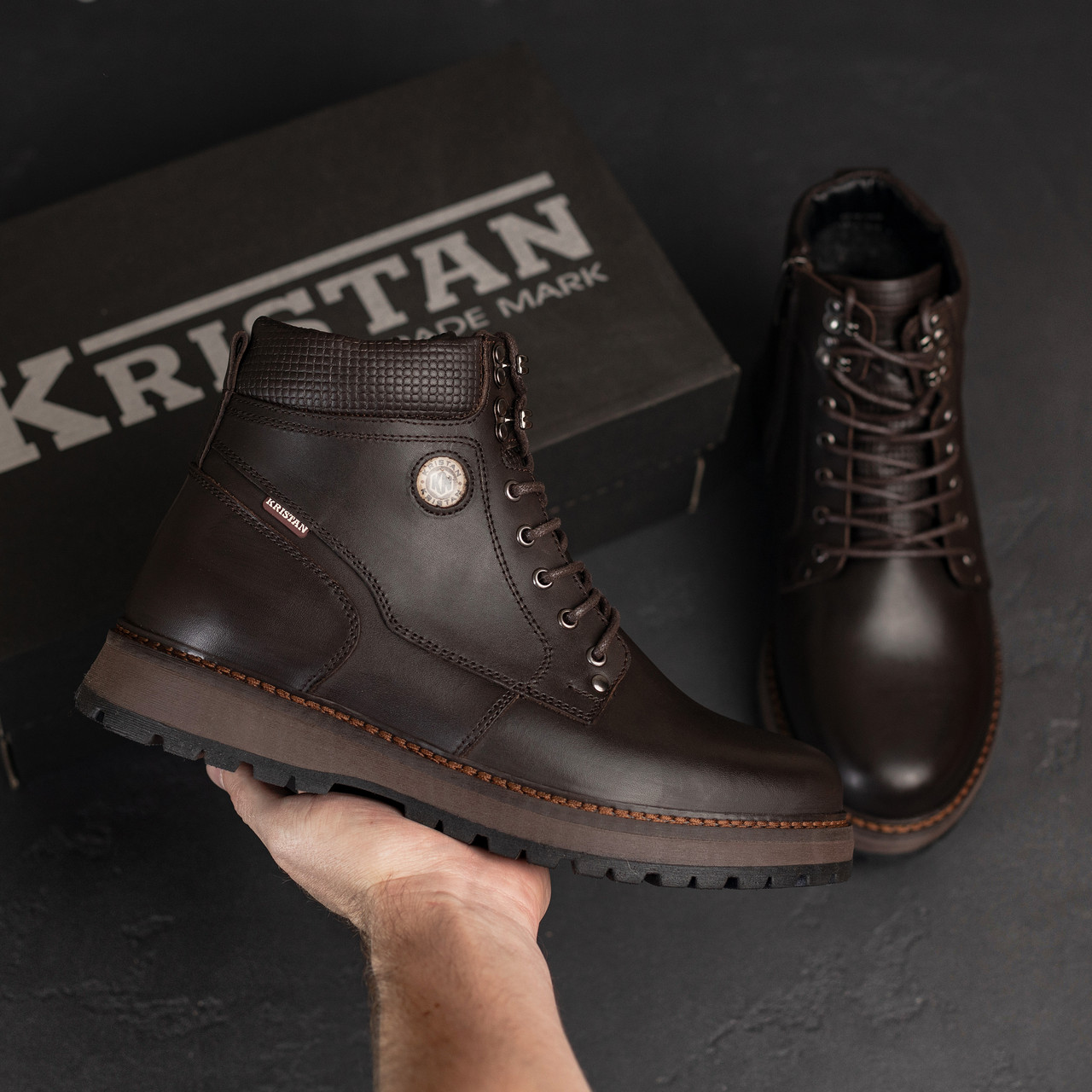 Новинка нашого інтернет-магазину Чоловічі зимові черевики Kristan Brown. Такий інтерес до них можна пояснити класичним дизайном, якістю черевиків і прийнятною ціною. Верх черевиків з натуральної шкіри. Вона дозволяє нозі дихати, захистити наші ноги від перепадів температури. Ви, мабуть, погодитесь, що черевики з натуральної шкіри виглядають більш презентабельніше, ніж з замінника. На п'ятірці обох черевиків миють додатковий шматочок шкіри, він по дизайну добре підходить і затепляє задню частину виробу.